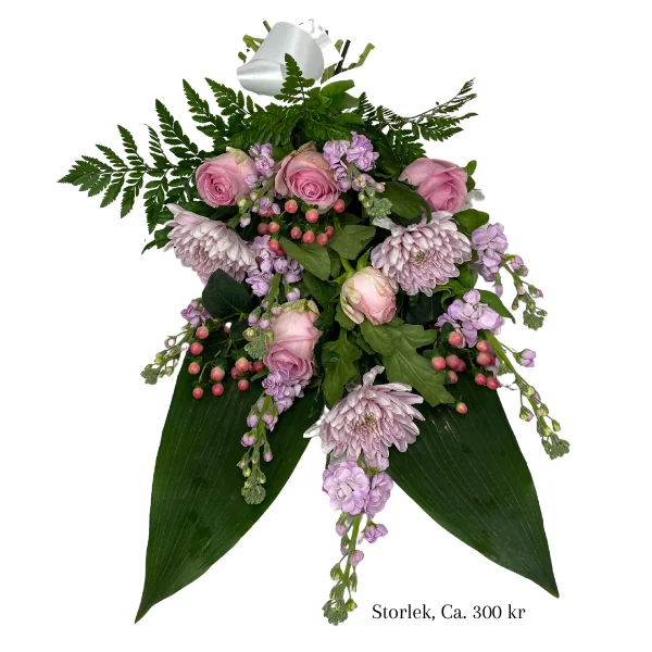 En klassisk liggande handbunden bukett till begravning. Våra begravningsbuketter gör vi efter kundens önskemål. Du väljer valfri färg samt pris och våra florister sätter ihop en fantastisk bukett med säsongen blommor. Vi gör vårt bästa för att matcha dina önskemål.