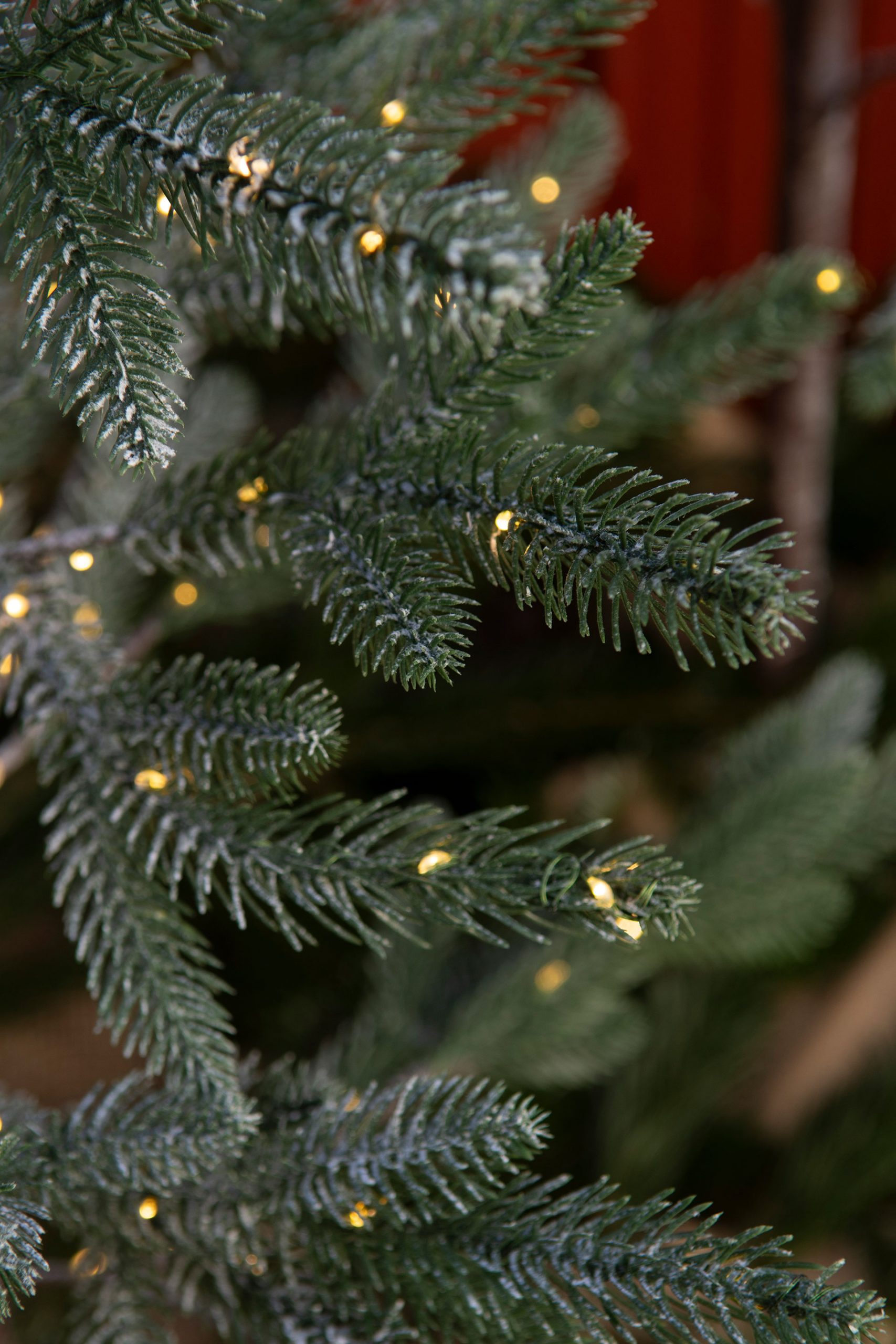 En frostad gran med höjden 150 cm och inbyggda LED-ljus som sprider stämning i vintermörkret. Perfekt för trädgård, balkong eller entré. Tillverkad i plast och metall. Finns i flera storlekar.