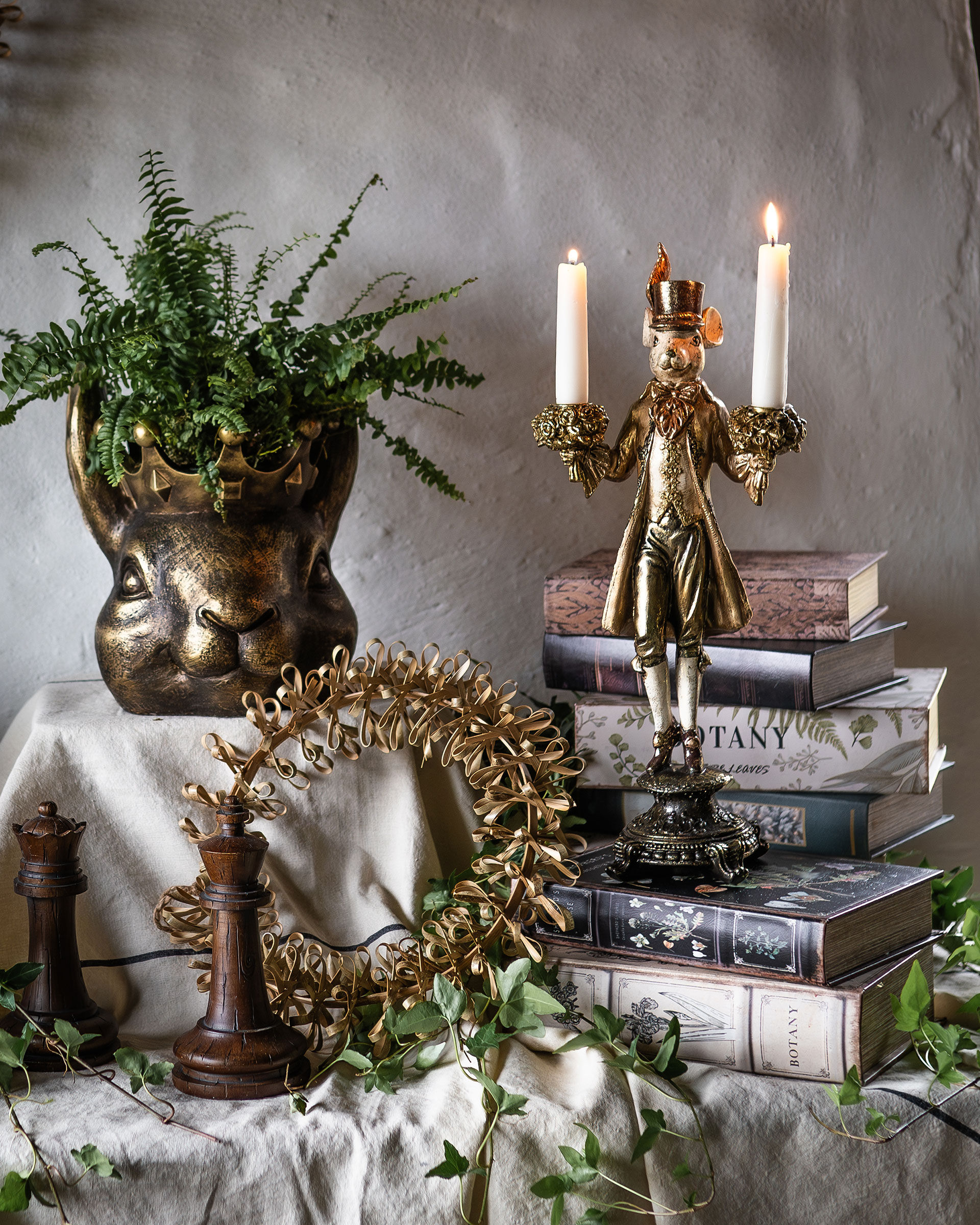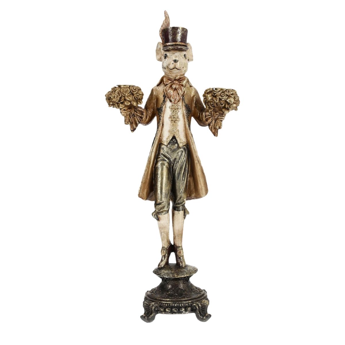 Denna lekfulla ljusstake föreställer en mus i elegant hatt och frack som håller två buketter i händerna där ljushållarna sitter. En rolig och dekorativ inredningsdetalj som drar blickarna till sig och passar perfekt både för dukningen och i vardagsrummet. Passar kronljus.