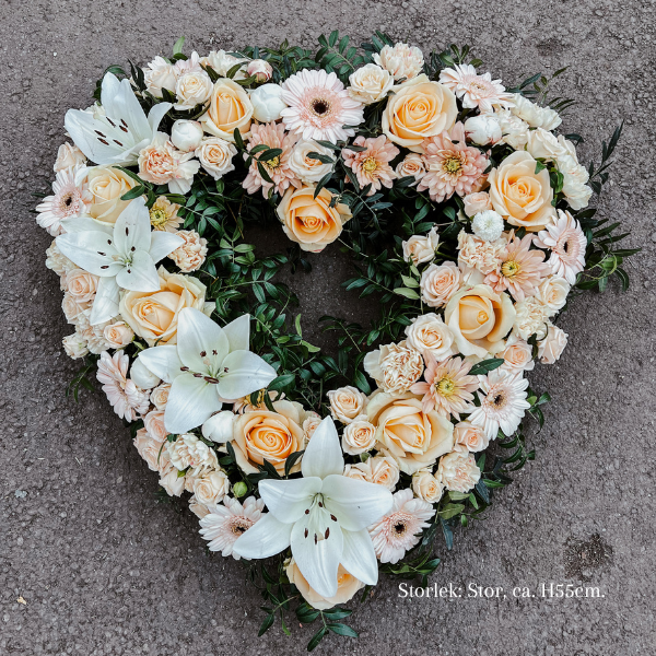 Öppet blomsterhjärta med mixade blommor i oasis. Våra begravningshjärtan gör vi efter kundens önskemål. Du väljer valfri färg samt storlek och våra florister sätter ihop en fantastisk dekoration med säsongen blommor. Vi gör vårt bästa för att matcha dina önskemål.